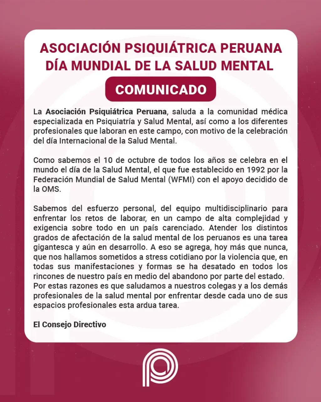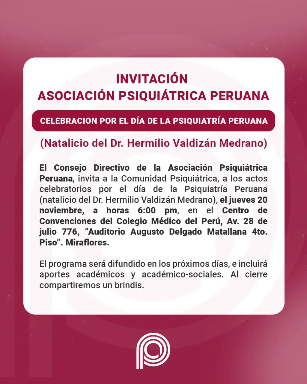 Comprometidos con el bienestar de la población peruana a través de la capacitación constante de profesionales, la difusión de conocimientos actualizados y el fomento de investigaciones innovadoras en el campo de la psiquiatría.